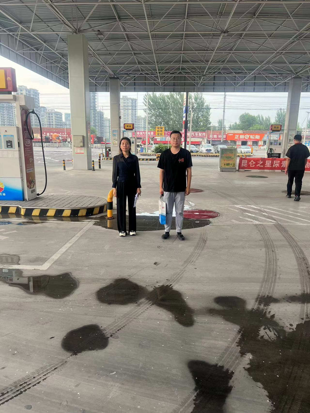 项目简介 | 该站位于内黄县城关镇胡庄村,负责人李前锋,站长:任光荣,占地面积2420m2。站外东侧为颛顼大道(城市次干路),南侧为小路及农机超市(三类保护物)、餐馆(明火火花地点),西侧为万里物流办公楼4F(三类保护物),北侧为废弃加气站。成品油证书经营范围为:乙醇汽油、柴油、煤油。加油区有自吸式双枪加油机4台(其中2台汽油加油机,2台柴油加油机),油罐区有SF乙醇汽油罐2台,SF柴油罐2台,罐容量均为30m3,总容积为90m3(柴油折半计入)。该站油品折合总容积为: V汽+1/2V柴=(30×2)+1/2×(30×2)=90(m3) 根据GB 50156-2021《汽车加油加气加氢站技术标准》对加油站的等级划分,该站属于三级加油站,该站汽油设备设置有油气回收系统。 | |||