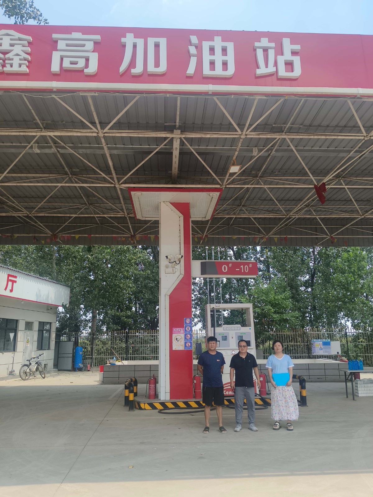 项目简介 | 鹿邑县鑫高加油站位于河南省周口市鹿邑县辛集镇大陈行政村尚屠庄自然村南100米辛集至高集乡道东侧,《危险化学品经营许可证》(豫鹿危化经字【2022】000134号)有效期限至2025年09月26日,许可范围:乙醇汽油、柴油(闭杯闪点≤60℃)。 该加油站占地面积约为700m2,有员工2人,其中安全生产管理人员1人,无特种作业人员。加油站设有2台加油机,有卧式埋地储油罐3座(SF双层油罐),其中2座15m3乙醇汽油罐、1座20m3柴油罐(柴油折半计入),油罐总容积为15×2+20×1/2 =40m3。根据GB50156-2021《汽车加油加气加氢站技术标准》第3.0.9条对加油站的等级划分,该加油站为三级加油站。该加油站加油采用自吸式加油工艺,汽油设备设置有加油和卸油油气回收系统。 | |||