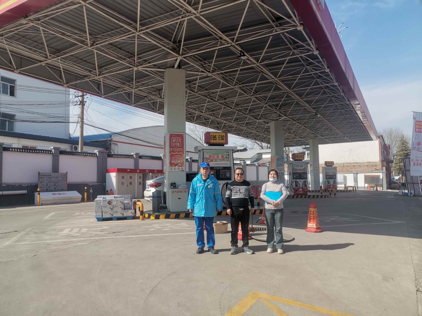 项目简介 | 中国石油天然气股份有限公司河南洛阳第二十三加油站位于洛阳市洛龙区龙门路87号;占地面积约2908.3m2,现有员工5人,其中安全生产管理人员1人,无特种作业人员;《危险化学品经营许可证》(证书编号:豫C危化经字[2023]00060号),有效期至2024年07月02日,许可范围:乙醇汽油、柴油。 该加油站罩棚布置在站房北侧,在罩棚下设3台加油机,安装在加油岛上。罐区布置在罩棚行车道下,有地埋式储油罐4座(单层钢制罐+承重防渗罐池),其中汽油罐2座(2×30m3)、柴油罐2座(2×30m3)。根据GB50156-2021《汽车加油加气加氢站技术标准》表3.0.9加油站的等级划分,该站油罐总容积为30×2+30×2×1/2=90m3(柴油折半计入),属于三级加油站。该站采用潜泵式加油工艺,设有加油、卸油油气回收系统。 该站东侧为龙门大道;南侧为民房;西侧为幼儿园(一类)、卫生院(一类)、停车库、架空通信线和架空电力线(有绝缘层);北侧为民房(三类)和变压器。站内汽油、柴油工艺设备与站外建构筑物的安全间距均符合GB50156-2021的要求。该加油站站内设施的防火间距满足要求。 | |||