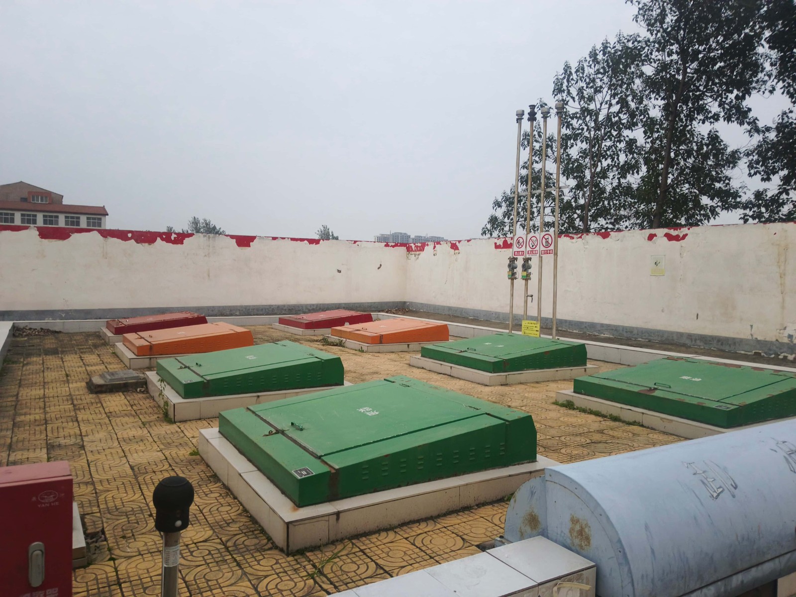 项目简介 | 中国石油天然气股份有限公司河南通许第 一加油站位于通许县郑永公路与文卫路交叉口西50米路北。《危险化学品经营许可证》(证书编号:豫B危化经字[2023]00169号),有效期限至2026年1月27日,许可范围:乙醇汽油、柴油。 该加油站占地面积2800m2,现有员工3人,其中安全生产管理人员1人。站房设在站区中部,罩棚布置在站房南侧,在罩棚下设4台双枪加油机,分两排平行布置,安装在加油岛上;罐区布置在站房东北侧,设有4座双层SF卧式油罐,埋地设在非行车道下,其中30m3汽油罐2座、30m3柴油罐2座;密闭卸油口设在罐区南侧,通气管口设在罐区东侧。根据GB50156-2021《汽车加油加气加氢站技术标准》表3.0.9加油站的等级划分,该站油罐总容积为30×2+30×2×1/2 =90m3(柴油折半计入),属于三级加油站。 该加油站采用自吸式加油工艺,设有汽油加油和卸油油气回收系统。 该加油站东侧为空地、杂物棚(三类保护物)、民房(三类保护物),西侧为民房(三类保护物)、架空通信线,南侧为G343国道、架空电力线(有绝缘层)、架空通信线,北侧为农田。站内汽油、柴油工艺设备与站外建构筑物的安全间距均符合GB50156-2021的要求。该加油站站内设施的防火间距满足要求。 | |||